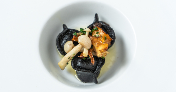 Kook de bouillon en giet in een schenkkan. Plaats onderaan in het bord enkele dotjes zwarte look. Gaar de pasta in ruim en gezouten water, besprenkel na uithalen onmiddellijk met olijfolie. Verdeel deze op de dotjes zwarte look. Werk eventueel af met gebakken verse champignons.