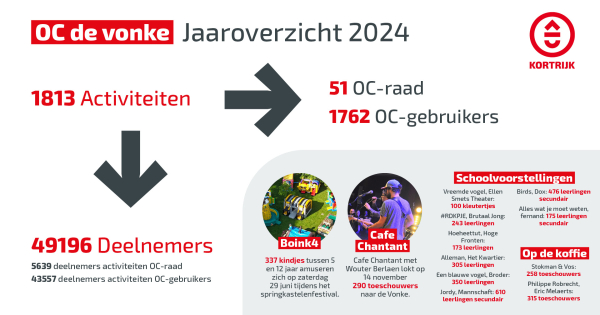 Op 14 november brengt Wouter Berlaen met band zijn nieuwste plaat, ’t Gesproken Dagblad voor 290 toeschouwers in de Vonke. Eens in de maand op donderdagavond vinden de café chantants plaats in OC De Vonke tussen oktober en april.