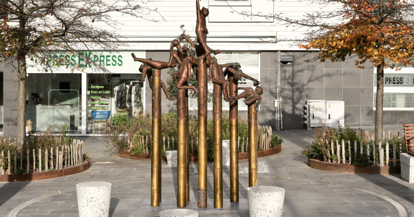 De fontein 'De Dorstigen Laven' is vervaardigd door kunstenaar Jef Claerhout (Tielt, 1937 - Oedelem, 2022). De beeldengroep van geelkoperen figuren is ook wel bekend als 'De Drinkers' en toont negen personen met bekers waaruit fonteinen ontspringen en daardoor zichzelf of andere figuren laten 'drinken'.