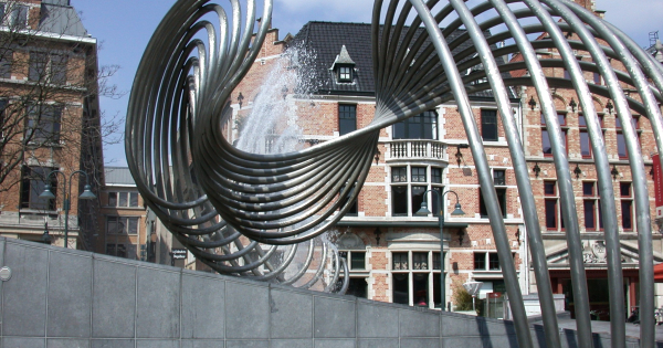 Het kunstwerk ‘De Golf’ was het winnend ontwerp uit de wedstrijd ‘Kunstwerk op het Schouwburgplein’ die in 1996 gelanceerd werd door Stad Kortrijk. De fontein van Olivier Strebelle werd gekozen - en in 2003 geïntegreerd op het plein - omwille van het contrast tussen de ronde vormen van het werk en de strakke vormgeving van het plein. De kunstenaar maakte nooit eerder een fontein en het werk is een primeur in zijn oeuvre. Het werk bestaat uit metalen buizen en spuitmonden op een hellend vlak die een golf verbeelden. Het monumentale werk (gewicht 5 ton) heeft slechts één raakpunt met het hellend vlak en de krachtstraal kan per buis geregeld worden. De complexiteit van de beweging is een technische krachttoer. Ondanks het monumentale karakter van het werk is de fontein zeer bewegelijk en transparant door de vormgeving en de gebruikte materialen.