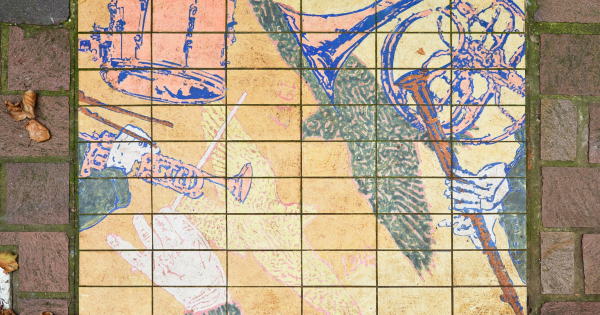 In de tweede tegel draait alles om muziek, meer bepaald om harmoniemuziek. De verschillende instrumenten en de zwierige hand van de dirigent brengen het muzikale verhaal meteen tot leven. Aalbeke is trots op zijn Koninklijke Harmonie Eendracht, een bijzonder bloeiende vereniging die in de hoogste klasse speelt en zo’n honderd muzikanten telt. De harmonie ontstond in 1947 uit de samensmelting van twee muziekmaatschappijen: Deugd en Vreugd en Sint-Cecilia. Opvallend is dat de ene oorspronkelijk katholiek was en de andere liberaal, maar samen vonden ze elkaar in de muziek. Het stichtingsjaar is op de tegel terug te vinden. De kunstenaar verwerkte ook een valk in het ontwerp, een verwijzing naar de adellijke afkomst van Sint-Cecilia, de patrones van de muzikanten.
