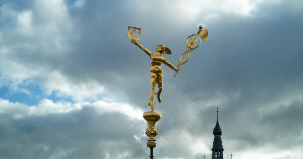 Mercurius is de Romeinse god van de handel en de winst. Hij is beschermer van reizigers en kooplieden. Mercurius wordt geacht voorspoed en zegen te brengen over de stad. Geen wonder dat het beeld daarom op de toren van het Belfort prijkt, onderdeel van de oude lakenhalle (14de eeuw), het centrum van handel in de Middeleeuwen.