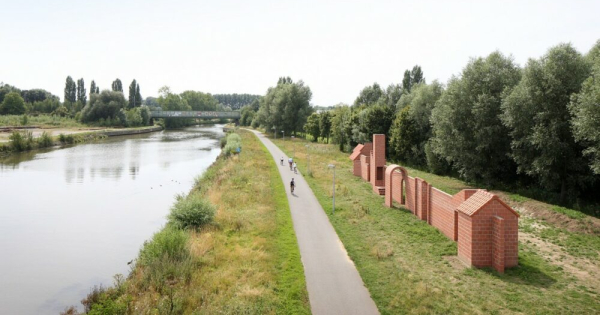 Langs het jaagpad van de Leie duikt onverwacht een merkwaardige structuur op: een lange muur van rode snelbouwstenen en dakpannen, die tegelijk herkenbaar en vervreemdend oogt. Sequence n°1 van kunstenaar en fotograaf Filip Dujardin lijkt op het eerste gezicht een onafgewerkt gebouw of een reststructuur – met een trap, een boog, een schoorsteen en een daklijn – alsof het begin van een huis zich in de open ruimte ontvouwt. Maar wie dichterbij komt, merkt dat het om iets anders gaat. De installatie heeft geen binnenkant, geen functie, geen sluitend geheel. Ze bestaat puur uit vorm: een aaneenschakeling van architecturale gebaren die nergens toe leidt.