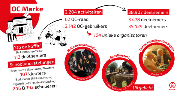 Een glaskunsttentoonstelling, ons jaarlijkse speelkasteel en een Halloweenwandeling. Met tal van organisaties zetten we onze schouders onder deze succesvolle sfeerwandeling. Dit zijn maar enkele activiteiten tussen vele andere. Alles samengeteld, activiteiten OC-raad en gebruikers, vonden er 2.204 activiteiten plaats in OC Marke. We duiken even in de cijfers en weetjes.